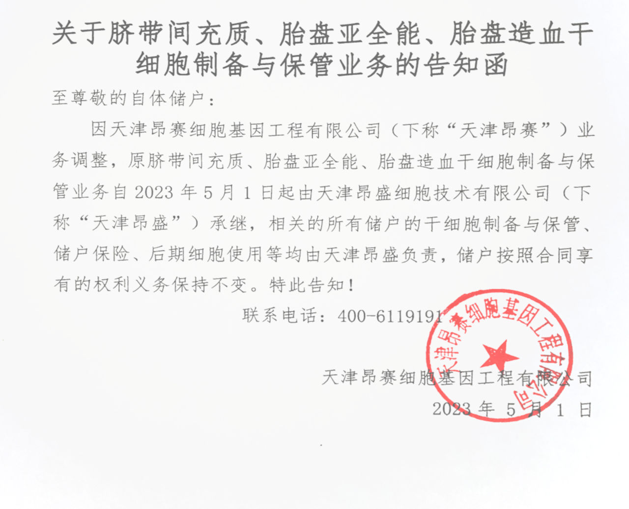 至尊敬的自體儲戶: 因天津昂賽細胞基因工程有限公司(下稱“天津昂賽”)業(yè)務調(diào)整,原臍帶間充質(zhì)、胎盤亞全能、胎盤造血干細胞制備與保管業(yè)務自2023年5月1日起由天津昂盛細胞技術有限公司