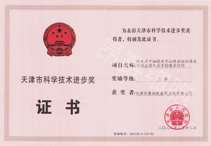我司與南開(kāi)大學(xué)、天津市人民醫(yī)院共同申報(bào)的項(xiàng)目《間充質(zhì)干細(xì)胞及外泌體在組織再生中的應(yīng)用與分子影像學(xué)評(píng)價(jià)》獲得2021年度天津市科學(xué)技術(shù)進(jìn)步獎(jiǎng)二等獎(jiǎng)。