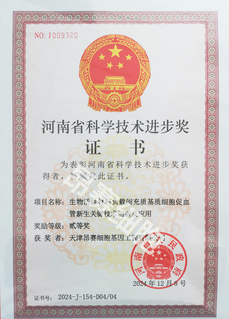 公司合作項(xiàng)目《生物活性材料負(fù)載間充質(zhì)細(xì)胞粗促血管新生關(guān)鍵技術(shù)創(chuàng)新及應(yīng)用》獲得河南省科學(xué)技術(shù)進(jìn)步二等獎(jiǎng)。