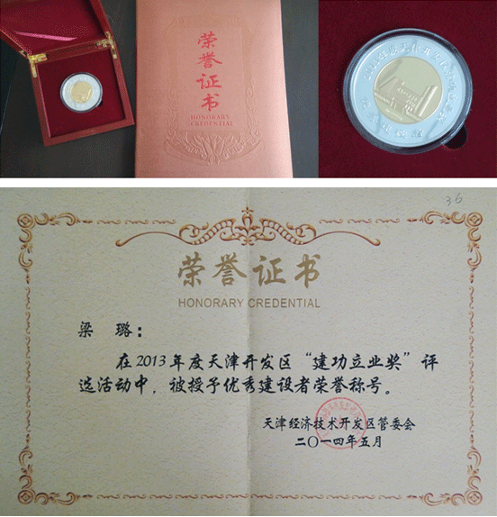 ? ? ? ? 2014年5月9日,天津開發(fā)區(qū)2013年度“百強企業(yè)”、“成長最快企業(yè)”、“科技創(chuàng)新單位”、“科技小巨人”、“社會責(zé)任貢獻(xiàn)獎”、“建功立業(yè)獎”等獎項頒獎大會在投資服務(wù)中心舉行。會上,我公司技術(shù)開發(fā)部副經(jīng)理梁璐博士被授予優(yōu)秀建設(shè)者榮譽稱號。
